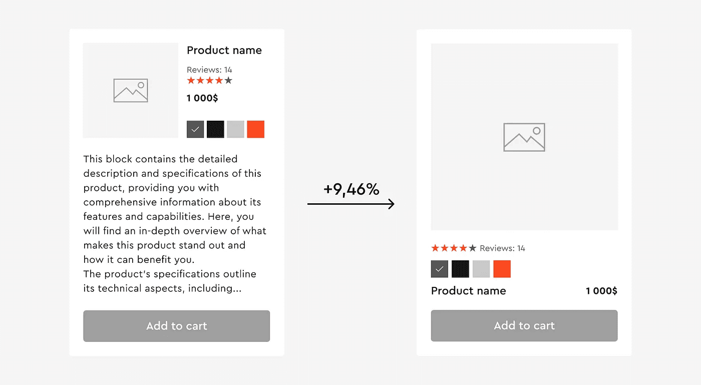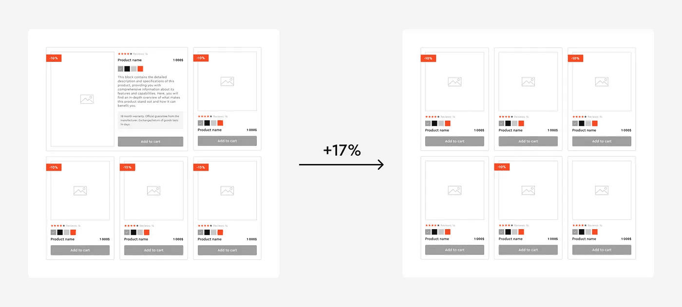 Mahsulot kartochkalarining o'lchamlari ham konversiya koeffitsientiga ta'sir qilishi mumkin. Blue Acorn kompaniyasi mahsulotlar ro'yxatining ikki versiyasini sinab ko'rdi: birida barcha kartochkalar bir xil o'lchamda bo'lsa, boshqasida — turlicha.