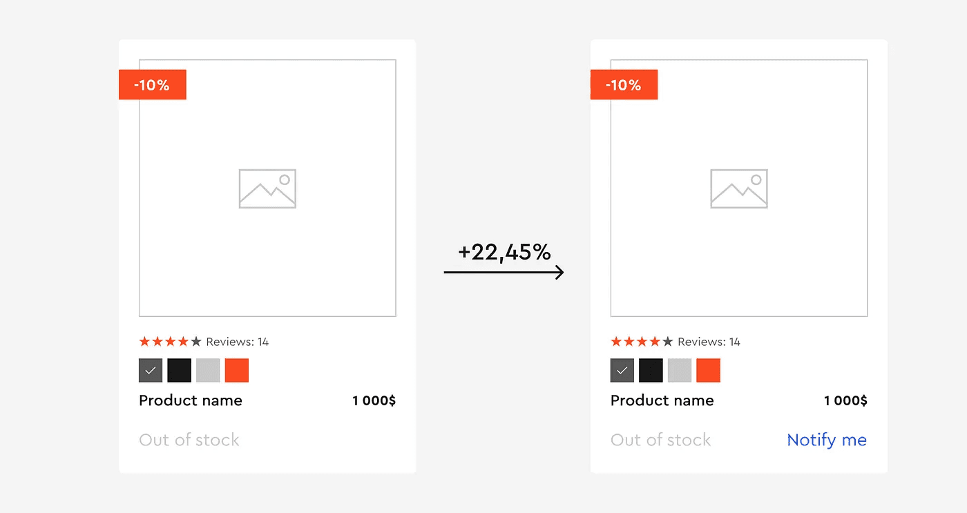 Do'kondan vaqtincha mavjud bo'lmagan mahsulotlarni olib tashlamang. "Savatchaga qo'shish" tugmasini "Kelganligi haqida xabar olish" tugmasi va email kiritish maydonchasi bilan almashtiring. Keyinchalik, mahsulot qayta mavjud bo'lganda, foydalanuvchiga mos ravishda elektron pochta orqali xabar yuboring. Bizning sinovlarimizda ushbu strategiya konversiyani 22,45% ga oshirishga yordam berdi.