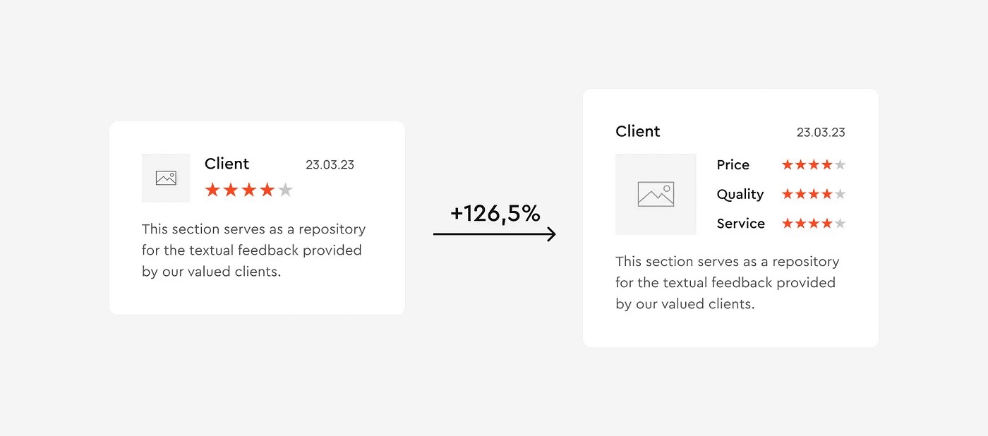 Yana bir qiziqarli misol — XYZ premium turdagi qahva uskunalari ishlab chiqaruvchi kompaniya. Ular saytini yangilab, savdolarni oshirishni maqsad qildi. Ularning saytida oldin mijozlar qisqa izohlar qoldirishi mumkin bo'lgan bo'lsa-da, ular bu jarayonni yaxshilashga qaror qilishdi. Ular mijozlarga batafsil izohlar qoldirish, tajribalarini bo'lishish, mahsulotning afzalliklarini ko'rsatish va turli atributlarni baholash imkoniyatini taqdim etdilar.