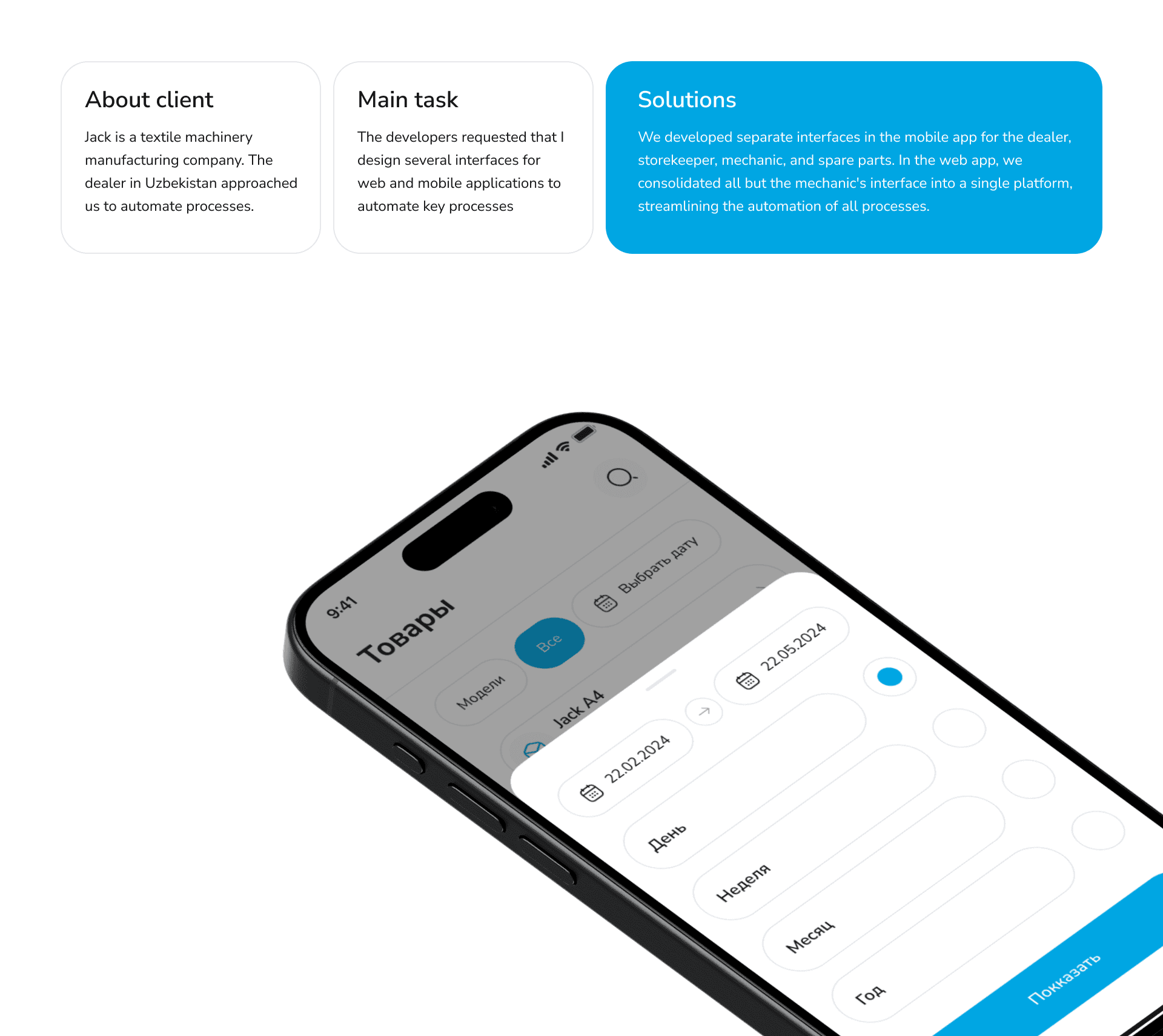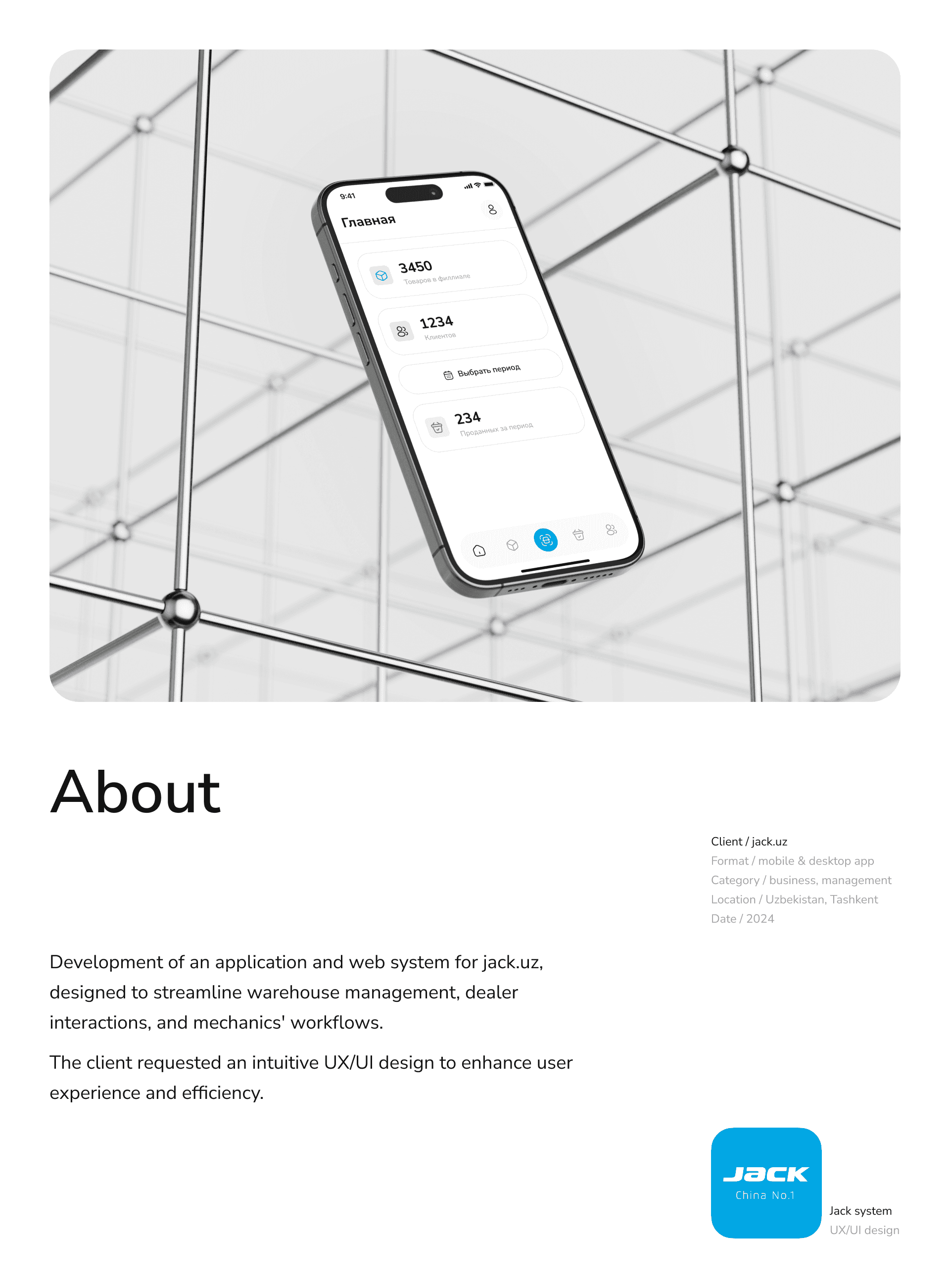Development of an application and web system for jack.uz, designed to streamline warehouse management, dealer interactions, and mechanics' workflows. The client requested an intuitive UX/UI design to enhance user experience and efficiency.